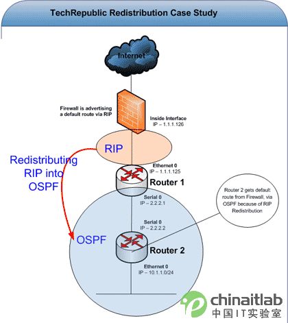防火墻在圖的頂部,連接著路由器1.路由器1連著路由器2(在實際網絡里面,還可能繼續連下去)。 路由器1就是我們的重分配點。在這里我們將對來自防火墻的RIP路由信息重分配,然后放入到OSPF網絡中。因此,路由器1需要運行RIP和。即在連接防火墻的接口上運行RIP,在連接路由器2的接口上運行OSPF. 這一步結束后,我們需要察看路由器2的默認路由,最初這由防火墻設置完成。只有路由器1具備默認路由的時候,路由器2才會有默認路由。這里非常重要:盡管你可以持續從路由器1發送默認路由到路由器2而無需使用重分配,你還是需要使得路由器2具備默認路由。 下面就是路由器1的IP地址配置 路由器1的路由配置 我們可以看到,路由器在串口上啟用了OSPF ,在以太口上啟用了RIP.此外,你需要注意下面這些命令: 在OSPF路由過程中,該命令將把任何使用RIP協議網絡收到的路由信息發給OSPF.subnet關鍵字高速路由器對所有網絡(包括子網)進行重分配。按照默認設置,該命令將會僅僅對標準網絡重分配。 在OSPF路由過程中,該命令將允許OSPF廣播默認路由。按照默認設置,該命令將僅僅對的確存在的唯一默認路由進行廣播。然而,你也可以在命令末尾使用always關鍵字提示路由器通過OSPF廣播默認路由,而不管路由到底是不是唯一存在的。 網絡的神奇作用吸引著越來越多的用戶加入其中,正因如此,網絡的承受能力也面臨著越來越嚴峻的考驗―從硬件上、軟件上、所用標準上......,各項技術都需要適時應勢,對應發展,這正是網絡迅速走向進步的催化劑。 |