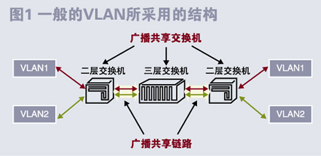從圖1可清楚地看出所共享的網(wǎng)絡(luò)資源(交換機(jī)和鏈路)。在正常情況下,VLAN間的這種影響不被我們所注意,原因是共享的交換機(jī)有足夠的交換能力,鏈路不是很擁擠,但在某一VLAN出現(xiàn)異常時(shí)(如感染病毒或出現(xiàn)環(huán)路)情況就不同了。這時(shí)被感染VLAN(如VLAN1)中的大量數(shù)據(jù)幀將擠占該VLAN所及的所有交換機(jī)的CPU資源、背板帶寬,并長時(shí)間占用物理鏈路,其他VLAN(如VLAN2)中的設(shè)備盡管“看”不到出現(xiàn)異常VLAN中的數(shù)據(jù)幀,但其所依賴的網(wǎng)絡(luò)資源已被用盡,因此,VLAN1所覆蓋的網(wǎng)絡(luò)區(qū)域就會出現(xiàn)異常。如果故障點(diǎn)發(fā)生在核心交換機(jī)附近,那么整個(gè)網(wǎng)絡(luò)就有可能癱瘓。這在各網(wǎng)絡(luò)拓?fù)鋵咏粨Q機(jī)的性能相差不多的情況下尤為嚴(yán)重。