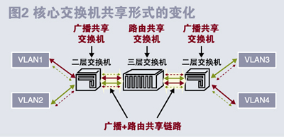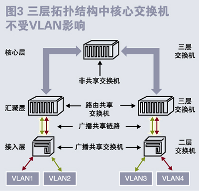 有人可能會說,把核心交換機(jī)從二層提到了三層,性能會下降。這種說法無疑是正確的,但這點(diǎn)性能的降低對于當(dāng)今的三層交換機(jī)所能提供的性能來說已經(jīng)算不得什么了。從圖2還可以看出,盡管受單個(gè)VLAN影響的程度和范圍均變小,但共享鏈路的長度和強(qiáng)度并沒有本質(zhì)的變化。