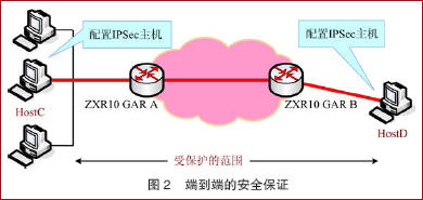 在傳輸模式下,路由器對于報文的加密和認證可以有基于協議、源端口和源地址、目的端口和目的地址等多種模式。用戶可以通過管理模塊靈活地進行配置。 網絡安全 IPSec隧道和傳輸模式的各種組合應用,可以提供網絡各層面的安全保證。諸如:端到端的安全保證、內部網絡的保密、通過安全隧道構建安全的VPN、通過嵌套隧道實現不同級別的網絡安全等等。 端到端的安全保證 如圖2所示,在兩端主機上對報文進行IPSec封裝,中間路由器實現對有IPSec擴展頭的IPv6報文的透傳,從而實現端到端的安全保證。
