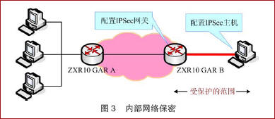 內部網絡保密 圖3所示的內部主機和互聯網上其他主機進行通信時,通過配置IPSec網關來保證內部網絡的安全。由于IPSec作為IPv6擴展報頭不能被中間路由器而只能被目的節點解析處理,因此,IPSec網關可以通過IPSec隧道的方式實現,或者通過IPv6擴展頭中提供的路由頭和逐跳選項頭并結合應用層網關技術來實現。其中后者實現方式更加靈活,有利于提供完善的內部網絡安全,但是比較復雜。