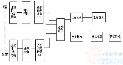 圖1光通信系統(tǒng)的基本組成結(jié)構(gòu)圖 它適合于光纖模擬通信系統(tǒng)中,而且也適用于光纖數(shù)字通信系統(tǒng)和數(shù)據(jù)通信系統(tǒng)。在光纖模擬通信系統(tǒng)中,電信號處理是指對基帶信號進行放大、預(yù)調(diào)制等處理,而電信號反處理則是發(fā)端處理的逆過程,即解調(diào)、放大等處理。在光纖數(shù)字通信系統(tǒng)中,電信號處理是指對基帶信號進行放大、取樣、量化,即脈沖編碼調(diào)制(PCM)和線路碼型編碼處理等,而電信號反處理也是發(fā)端的逆過程。對數(shù)據(jù)光纖通信,電信號處理主要包括對信號進行放大,和數(shù)字通信系統(tǒng)不同的是它不需要碼型變換。 3光端機的作用和目前光端機的狀況 在光纖通信系統(tǒng)中,光發(fā)射機是光端機、光中繼器的重要組成部分,它的最基本功能是將要傳輸?shù)碾娦盘栒{(diào)制在光波上,并將其注入到光纖線路中。光接收機的主要功能是將接收的光信號變換為原電信號,并且用自動增益控制電路(AGC)保證穩(wěn)定的輸出,光接收的主要部件是光檢測器,它的主要任務(wù)是進行光電轉(zhuǎn)換。從光發(fā)送端輸出經(jīng)光纜線路傳輸被衰減的光信號到達接收端已是很微弱的了,為了有效地進行光電轉(zhuǎn)換,系統(tǒng)要求光檢測器要響應(yīng)度高、噪聲低,響應(yīng)速度快,工作穩(wěn)定可靠。 目前的數(shù)據(jù)光端機已經(jīng)有一段發(fā)展歷程了,不在是簡單的一路或四路的,也不在是單純的某一接口了,而已經(jīng)達到上百路(如120路、240路等),各種不同接口(RS-232、RS-485、USB等)相當(dāng)成熟的地步了,像武漢波仕電子、北京訊風(fēng)通信、杭州億幫通信等公司的主要產(chǎn)品就是光端機,其中波仕電子的RS-232單模和多模的光端機還可以做到無須電源。本文僅就八路來說明其復(fù)用原理。 4數(shù)據(jù)光端機設(shè)計所要達到的目的和功能及意義 本設(shè)計為多路RS-232C接口標(biāo)準(zhǔn)是一種廣泛使用的普及標(biāo)準(zhǔn)。它涉及使用的普及標(biāo)準(zhǔn)。它涉及的范圍很廣,遠遠超出了通信和計算機的領(lǐng)域。60年代中期,幾乎毫無例外的使用電話交換網(wǎng)實現(xiàn)遠程訪問,于是RS-232C接口進行本地通信,因此使用更加廣泛。本設(shè)計正是基于RS-232串行口通過光纖傳輸。 隨著分布計算機的建立,所需通信設(shè)備費用逐漸成為用戶所關(guān)心的主要問題,為了減少這些費用,通過研究大量網(wǎng)絡(luò)結(jié)構(gòu),從而確定盡可能采用專用設(shè)備。很多網(wǎng)絡(luò)是地理分布的用戶訪問公用計算設(shè)備,將中心的地區(qū)建設(shè)成為鏈接這些用戶到計算機的服務(wù)中心。盡管當(dāng)終端業(yè)務(wù)量較少,使用專用租用線費用不太合理,但若能采用很多終端共用通信設(shè)備的結(jié)構(gòu),一般就能減少對一組用戶提供通信的積累費用,而多路復(fù)用器的利用就可能用一條高速線路承擔(dān)原來有一組低俗線路分別傳輸?shù)臉I(yè)務(wù)量,所以當(dāng)同一地理區(qū)域的大量數(shù)據(jù)終端進行通信時,或者但任意距離的很多租用線并行傳輸時應(yīng)考慮使用多路復(fù)用器。 本數(shù)據(jù)光端機采用多路的設(shè)計,不但可以大大利用了線路,充分利用光纖巨大的帶寬資源。并且可以更廣泛的應(yīng)用于各個領(lǐng)域,本設(shè)計的八路復(fù)用技術(shù),可用八路信道傳輸不同的信息,將不同信息復(fù)用到一條光中進行傳輸,節(jié)省了設(shè)備,在現(xiàn)場的應(yīng)用中可在同一系統(tǒng)中,將多種控制信息和數(shù)據(jù)信息用一臺光端機進行傳輸,可同時連接計算機及其他符合RS-232標(biāo)準(zhǔn)的終端,方便控制和操作。這就是多路復(fù)用光端機的設(shè)計意義之所在,本文僅以八路復(fù)用來起到拋磚引玉的作用。 5數(shù)據(jù)光端機的設(shè)計整體說明 整體電路的原理框圖如圖2所示:它將若干終端多路接入一個高速數(shù)據(jù)鏈路中,發(fā)送過程由計算機或終端傳送來的RS-232C標(biāo)準(zhǔn)信號先要進行電平轉(zhuǎn)換,將RS-232C電平轉(zhuǎn)換為TTL電平,以便和后續(xù)電路兼容,再經(jīng)過MOTOROLA的MC145428異步同步轉(zhuǎn)換芯片將RS-232C幀結(jié)構(gòu)中的起始位,停止位去除后,轉(zhuǎn)換為同步輸出。再經(jīng)過一個多路復(fù)用電路將多路信號復(fù)用唯一路徑LED驅(qū)動后再對光源進行調(diào)制,將電信號轉(zhuǎn)換為光信號發(fā)送到光纖中傳輸。