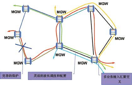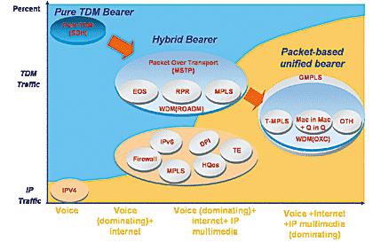 圖3 微基站“BBU+ RRU”通信環境下應用效果對比 綜上所述,TD配套傳輸網絡主要采用MSTP技術,實現對TDM及數據業務的接入、處理、調度,核心層及RRU-BBU間適度引入WDM,實現大顆粒數據業務的高效傳送與調度,節省光纖資源。該方案既能滿足TD當前的建設需求,也能適應TD中遠期的動態發展。 二、TD傳輸網建設方式探討 現有傳輸網是否已滿足TD網絡建設需求?是否需重新規劃建設傳輸網絡?這是網絡規劃實施者必須考慮的問題。下面將對現網與所需TD配套傳輸網絡進行比較: 從站點部署角度看,受覆蓋能力及規劃方式的限制,部分TD基站與2G基站不同址; 密集商業區、奧運場館大多采用的“BBU+RRU”分布式基站方式將導致帶寬需求急劇增長,現有網絡部分區域接近飽和,剩余帶寬難以支撐TD網絡的新增業務需求。此外,由于幾年來2G、大客戶等業務劇增及業務的突發性和不平衡性,部分區域網絡雖具有較大的容量,但在全網調度方面出現“瓶頸”,網絡資源利用率低、網絡業務不夠安全等問題也日益突出; 早期傳輸網絡主要提供2M通路業務,接口速率低、種類單一,中低端設備不具備容量平滑升級能力,數據類業務處理能力較差,尤其是大顆粒數據業務的承載效率低; TD網絡目前仍處于試驗性質,距離大規模商用尚有一段距離,TD網絡持續的技術演進、基站站型升級、規劃調整等將給現有網絡帶來振蕩,對現有2G業務、大客戶業務等有不利影響。 結合TD網絡站點規劃及TD技術發展預測等各方面情況,建議規劃獨立的TD配套傳輸網絡,以新建網絡為主,適度引入波分技術。 三、TD傳輸網遠期發展趨勢 近年來,通信行業中數據業務迅猛發展,業務IP化已成大勢所趨,數據多媒體業務尤其是語音、視頻IP化取得了重大進展,導致了傳輸網承載信號從TDM到IP的逐漸轉變。 當前,技術成熟、應用廣泛的MSTP技術強調依托于SDH平臺。MSTP利用SDH網絡的多余電路(時隙)資源,實現對數據業務尤其是以太網業務的透明傳送,在此基礎上逐步實現了功能的深化和演進,如增加L2交換、內嵌RPR功能以及MPLS功能等。但隨著3GIP化演進和相關技術及標準的成熟,伴隨著分組傳送技術、標準和產業鏈的成熟,以現有光纖網絡結構為基礎,建設基于分組傳送技術的城域傳送網,并輔以大容量WDM(OXC)的傳輸骨干網是未來的重要發展趨勢,參見圖4。