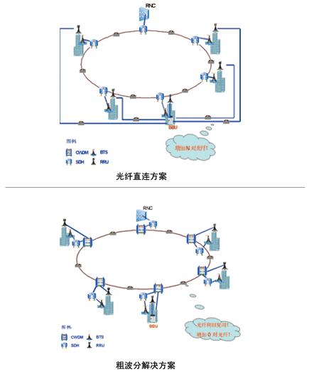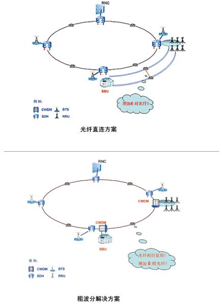 圖1 CN傳輸網引入WDM 2.基站光纖拉遠傳輸方案探討 中興通訊在TD-SCDMA基站技術上領先于業界,采用第二代分布式TD基站(BBU+RRU)技術,率先在青島現網應用。BBU和RRU之間通過光信號通信,相比傳統的大量電纜饋線到塔頂的方式具備以下兩個優點: (1)解決了線纜復雜、施工難度大的問題; (2)BBU和RRU分離,組網靈活方便,解決了機房、電源等多種難題。 通常BBU和RRU間采用光纖直連承載,然而經過分析,在BBU:RRU為1:N的應用場景下,用粗波分設備組網,以波長替代裸光纖將節省大量光纖資源,對2G網絡中已鋪設的光纖實現利舊復用,使網絡具有良好的擴展性。此外,避免了在密集城區鋪設新光纜,保證網絡快速建設。圖2和圖3分別顯示了在宏基站、微基站應用環境中,光纖直連及粗波分方案的應用效果對比。