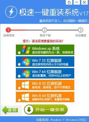 系統重裝xp怎么安裝圖1 (選擇系統)根據您個人喜好和電腦的配置選擇需要系統,直接點擊"開始一鍵安裝"即可,一般情況下單核處理器選擇XP,雙核和四核選擇win7,小于2G內存選擇32位,反之選擇64位!