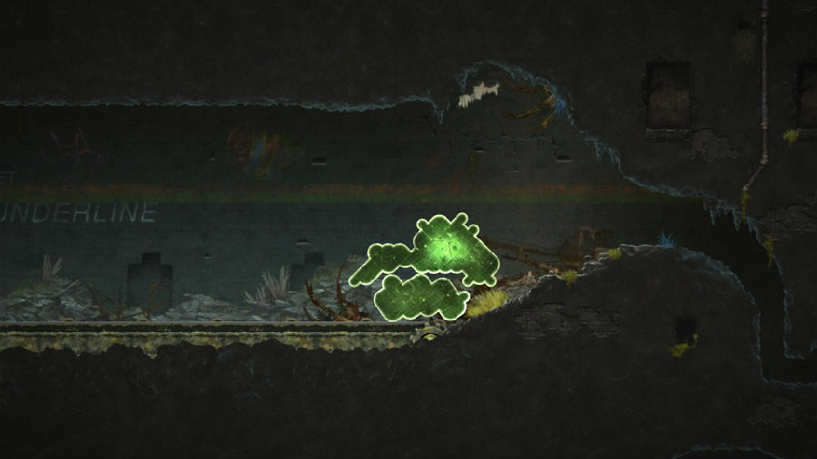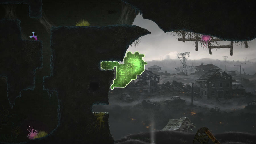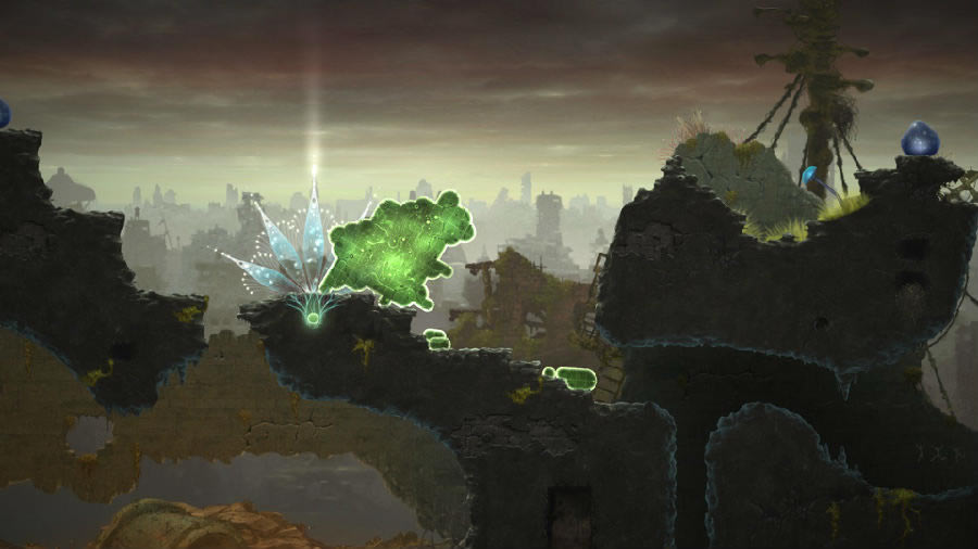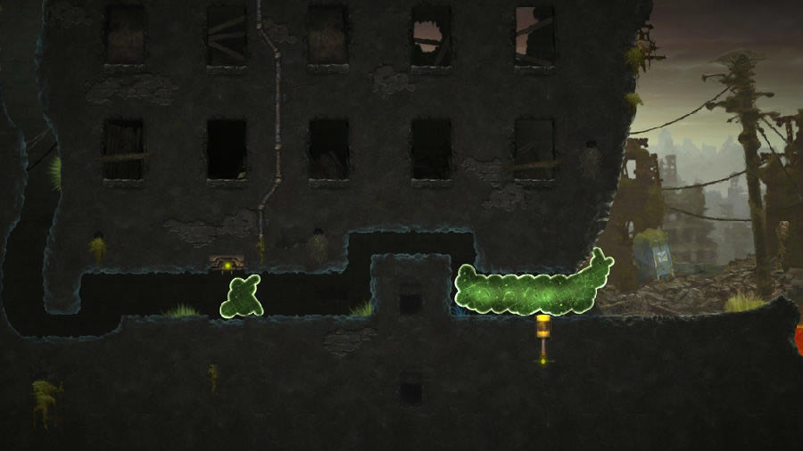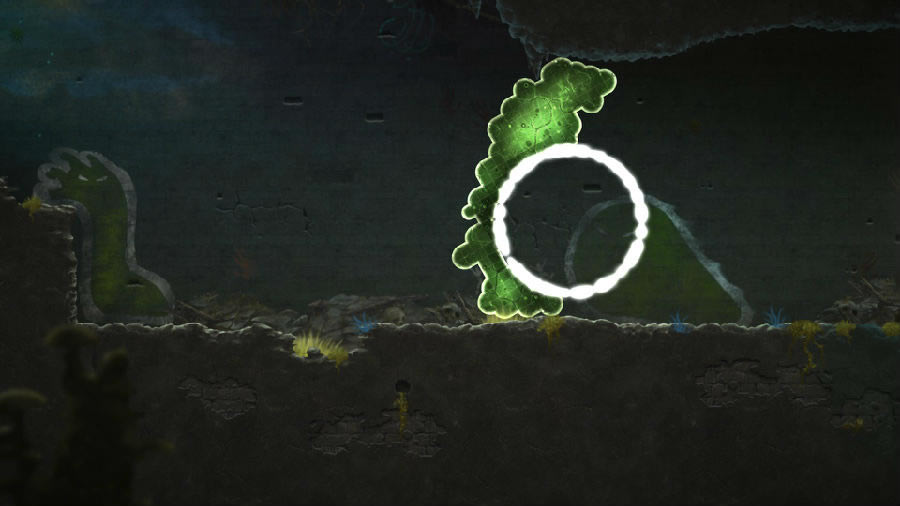 打破思維定勢的謎題 在一般意義上的解謎游戲中,我們都會扮演其中的一個角色,并控制它移動,在游戲世界中四處探索。而《蘑菇11》在玩法上卻別具一格,主角既不能跑也不能跳,玩家是以一個旁觀者的姿態給它施加一個外力,從而推動游戲的進程。因此,在玩這款游戲的時候你會發現,許多傳統的解謎思路都不管用了。 例如在第二關中需要爬上一個非常高的懸崖。按照傳統的解謎游戲思路來思考的話,就會想方設法地尋找電梯,或者隱藏的小道——畢竟正常的人是不可能直接爬上那么高的地方嘛。但是這款游戲的主角并不是一般人,充分利用它的“質量守恒”特性,真的就能直接爬上去。這個懸崖每隔一段距離都有一個非常小的凹痕,因此我們只需要像擠牙膏一樣把這坨翔的一小部分擠進去,再把地面上剩余的大部分身體全部摧毀,一切就迎刃而解了。在“質量守恒”規則的作用下,凹痕處的那一小部分會生長成完整的一部分,接下來需要做的只是重復上述動作,讓這坨翔利用凹痕逐漸“生長”到最上方。