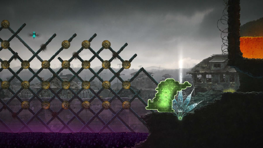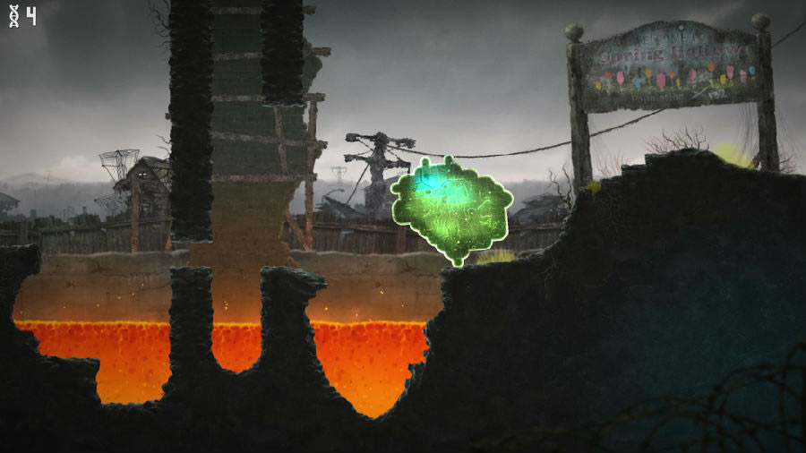 質量守恒的特性使這坨翔的生存能力變得極強,可是它在游戲世界中并不是絕對安全的。場景中分布著大量巖漿,如果所有部分都掉進了巖漿當中,則會被徹底蒸發掉。某些地方還有一種會噴毒液的蜘蛛,被毒液碰到的地方會先變成紫色,隨后逐漸融化掉。而且紫色部分會不斷向接觸的部分擴散,如果不及時把紫色部分割開,整個部分都會被“感染”,最終被徹底毀滅。