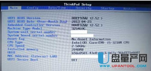 然后重啟電腦,U盤插上就會自動從U盤啟動了。 二、THINKPAD筆記本: 1、等待電腦屏幕出現開機信息時,連續按下F1鍵,就可以進入bios設置界面,如圖所示: