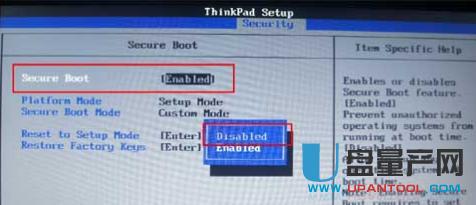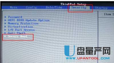 ![]() 2、將光標移動到“Security”選項卡,然后在下面窗口處選擇“Secure Boot”選項。下圖所示:
