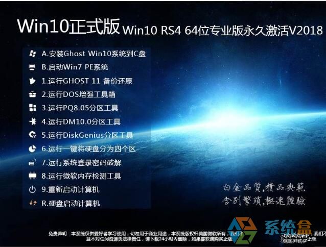 Windows 10是美國微軟公司研發的跨平臺及設備應用的操作系統。是微軟發布的最后一個獨立Windows版本。Windows 10共有7個發行版本,分別面向不同用戶和設備。截止至2018年3月7日,Windows 10正式版已更新至秋季創意者10.0.16299.309版本,預覽版已更新至春季創意者10.0.17120版本 Win10系統停止免費升級后,很多朋友就沒有辦法獲得永久免費使用的Windows10系統了,為此小編分享了款Ghost Win10專業版永久激活免費版分享給大家,不但永久激活免費使用,而且系統還經過了精致的優化,讓系統更加快速,喜歡Win10的朋友趕緊來下載體驗吧。![]() Win10破解版永久激活免費版(64位專業版) ![]() Win10破解版永久激活免費版(64位專業版) ![]() 更新內容:本版系統采用了微軟最新出的1804四月更新鏡像,通過預先優化制作,添加了VC++,.NET等必備運行庫,最新補丁 系統特點: 1、預先優化使系統更流暢(優化方案通過嚴格測試,保證系統穩定運行); 2、使用穩定的優化方案,保持系統穩定性和兼容性; 3、采用原版Windows10離線封裝,杜絕惡意插件(安裝過程自動清除無效啟動啟,惡意AUTO病毒); 4、免激活技術讓你安裝好聯網即可永久激活,完美破解; 5、專為筆記本設計,智能檢測筆記本設備(無線、數字鍵盤的開啟或關閉); 6、優化磁盤訪問速度、自動優化系統分區; 7、優化內存配置、優化進程優先等級; 8、加快程序運行速度、加快響應速度; 9、優化網絡連接數、IE下載連接數,上網速度更快; 10、優化系統緩存,加快前臺顯示速度,使Win10更流暢; 11、關閉系統錯誤報告,關閉兼容性助手; 12、系統啟動出錯禁止彈出錯誤信息; 13、開啟自動刷新、自動釋放不使用的DLL; 14、關閉Windows Defender; 15、支持固態硬盤SSD 4K對齊功能,支持最新筆記本電腦配置; 16、集成VC++ 2005 2008 2010 .Net 4.6 .Net 3.5; 17、添加 經典計算器 可以在開始——所有程序——附件中找到; 18、桌面顯示常用 計算機、網絡、等圖標 19、去除新建快捷方式時的“新建快捷方式”字樣; 20、優化磁盤緩存、優化磁盤占用; 21、優化內存讀取,自動釋放不用的DLL,減少占用; 22、優化啟動項、自啟服務加快開關機速度; 23、禁用Windows錯誤報告; 24、優化網絡連接,上網和下載更快速; 25、微軟拼音默認英文; 26、記事本啟用自動換行、顯示狀態欄; 27、隱藏此電腦中 7個文件夾(3D庫、下載、音樂、視頻、文檔等) 28、自動KMS 循環激活,如已經激活過的電腦采用數字權利激活。 1、關閉硬盤各分區的默認共享; 2、關閉管理默認共享; 3、關閉遠程注冊表服務; 4、加快開關機機速度,自動關閉停止響應; 5、加快開機速度副值; 6、減少開機滾動條滾動次數; 7、嚴格查殺系統的木馬與插件,確保系統純凈無毒; 8、系統安裝完畢自動卸載多余驅動,穩定可靠,確保恢復效果接近全新安裝版; 9、精心修復系統安全漏洞,免除被盜號的后顧之憂; 10、關閉錯誤報告;設置常用輸入法快捷鍵; 11、系統通過微軟正版認證系統在線認證,支持在線升級更新; 12、關閉計算機時自動結束不響應任務; 13、在不影響大多數軟件和硬件運行的前提下,已經盡可能關閉非必要服務; 14、自動安裝 AMD/Intel 雙核 CPU 驅動和優化程序,發揮新平臺的最大性能; 15、將IE瀏覽器和Edge游覽器放置到桌面方便用戶使用; 16、整合Xbox游戲平臺 社交互動性增強; 17、集成最新的DirectX ,帶給游戲全新的視覺體驗; 18、加強網絡的功能,比如域加入;高級備份功能;位置感知打印;脫機文件夾;移動中心(Mobility Center);演示模式(Presentation Mode)。 系統安裝硬件要求:1、微軟官方對Win10正式版的最低硬件要求為:2GHz及以上處理器、1GB(32位)或2GB(64位)RAM、至少16GB的硬盤可用空間,所以老PC也能夠輕松升級。另外,系統不能運行在RT及Windows N設備上; 2、C:盤分區須至少50GB,安裝完成后C:盤占用40GB左右。 一、硬盤安裝 1、首先下載一款Win10系統,一般是ISO后綴的,下載后右鍵使用WINRAR打開,然后解壓到D盤; ![]() 2、解壓文件夾中一般都會且一個 “安裝系統.EXE”,我們雙擊打開,如果是win8/win10要右鍵以管理員身份打開(執行前注意備份C盤重要資料!)