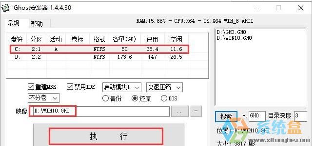 3、選擇列表中的系統盤(默認C盤),選擇“WIN10.GHO”映像文件,點擊執行。會提示是否重啟,點擊是,系統將自動安裝。整個安裝過程持續10到15分鐘,一切無需人工干預,請耐心等待。
