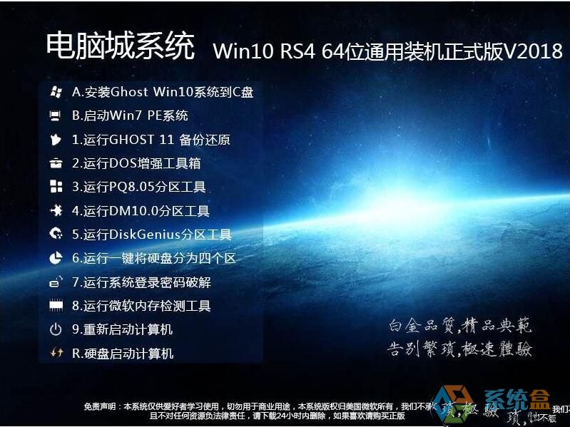 Windows 10是美國微軟公司研發的跨平臺及設備應用的操作系統。是微軟發布的最后一個獨立Windows版本。Windows 10共有7個發行版本,分別面向不同用戶和設備。截止至2018年3月7日,Windows 10正式版已更新至秋季創意者10.0.16299.309版本,預覽版已更新至春季創意者10.0.17120版本 電腦城GHOST WIN10 RS4 64位通用裝機正式版V2018.05是適合電腦城、電腦公司批量裝機的一款Win10系統。采用了微軟最新的Win10 1803 17134為核心精心制作,優化服務、啟動項、注冊表,動態鏈接庫,精簡了部分不需要的應用,極大的提高了系統運行速度和穩定性,加入符合國人的設置,如關閉自帶殺毒、去除小盾牌等等,讓Win10使用更簡單,系統自帶運行庫組件,完美運行絕大多數軟件、游戲,是兼容性很好的一款Win10系統,免激活。