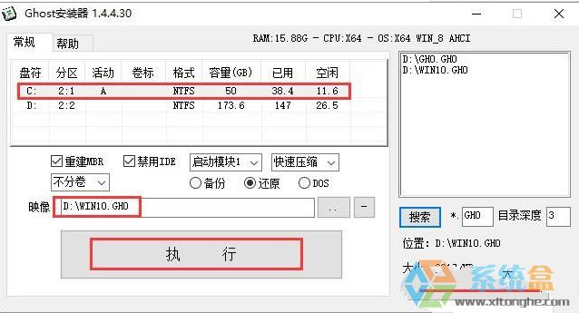 3、選擇列表中的系統(tǒng)盤(默認C盤),選擇“WIN10.GHO”映像文件,點擊執(zhí)行。會提示是否重啟,點擊是,系統(tǒng)將自動安裝。整個安裝過程持續(xù)10到15分鐘,一切無需人工干預,請耐心等待。