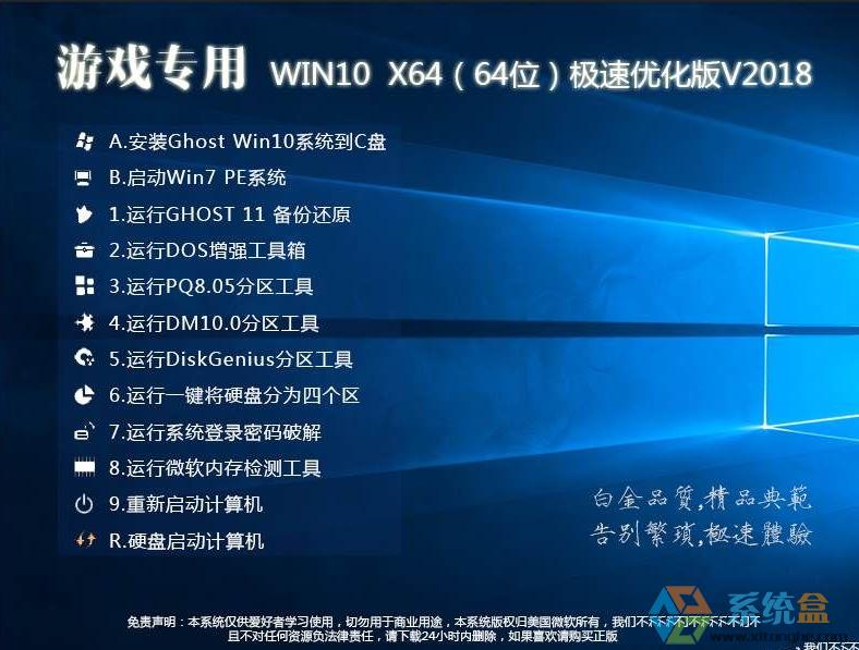 Windows 10是美國微軟公司研發的跨平臺及設備應用的操作系統。是微軟發布的最后一個獨立Windows版本。Windows 10共有7個發行版本,分別面向不同用戶和設備。截止至2018年3月7日,Windows 10正式版已更新至秋季創意者10.0.16299.309版本,預覽版已更新至春季創意者10.0.17120版本 很多用戶可能覺的Win10系統玩游戲不好,其實那是誤解,主要是由于win10內并沒有內置一些老游戲的必備組件,兼容性不好,加上優化不行,自然游戲體驗不佳,這里小編分享的游戲專用GHOST WIN10 X64(64位)極速優化正式版V2018,以游戲為主要體驗針對單機、大型網游優化加速,給你流暢體驗,進一步提高游戲流暢度FPS有一定的提升,精選匹配驅動程序,純凈的系統,預先優化的常用軟件,在每個地方進行極致優化,是一款值得推薦的Win10系統。![]() 安裝過程采用原版背景,兼容、穩定 ![]() Win10 RS3 1709 16299 系統信息。真正的Win10最新 64位正式版,可自動更新,可數字權利激活。游戲支持性能更佳。 ![]() Win10系統更新: 1、更新Windws10 RS3及安全更新至2018年3月最新; 2、更新WinRAR 5.41烈火漢化破解版; 3、更新IE Flash插件 Adobe Flash Player 28.0; 4、更新游戲必備組件DirectX 9.0C 2018及原生的DirectX 12 5、更新QQ至8.9正式版; 7、更新部分新款主板及顯卡驅動程序; 8、更新硬盤安裝器,減少硬盤安裝不成功的情況。 9、加入USB3.0支持、最新AHCI控制器驅動,避免檢測不到硬盤的情況。 10、最新支持200系列主板、最新intel 7代平臺支持。 Win10 64位(游戲專用定制)V2018系統特點及部分優化項目: 最重要:穩定、還是穩定;快速、還是快速; 1、采用最新技術,裝機部署快速10-15分鐘并可安裝完win7系統; 2、更新大部份系統補丁到2018年最新; 3、優化服務及組件,開機內存占用少; 4、整合IT天空智能驅動V6.6版本,99%的硬件都能智能驅動,匹配最合適的驅動; 5、整合全新的SRS磁盤控制器驅動,支持各種電腦; 6、終極優化系統,減少無用的進程,確保系統運行更快速; 9、破解系統主題安裝限制,破解TCP連接數; 10、集成 DirectX 最新版本運行庫,VB、VC++ 2005 SP1、2008、2010、2012等運行庫文件。 11、安裝完即激活,永久并支持在線更新; 常用軟件: