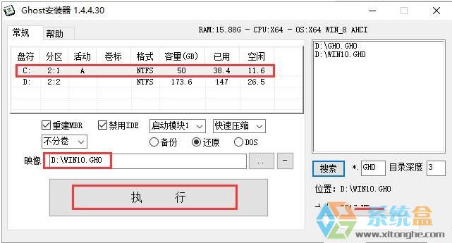 選擇列表中的系統盤(默認C盤),選擇“WIN10.GHO”映像文件,點擊執行。會提示是否重啟,點擊是,系統將自動安裝。整個安裝過程持續10到15分鐘,一切無需人工干預,請耐心等待。