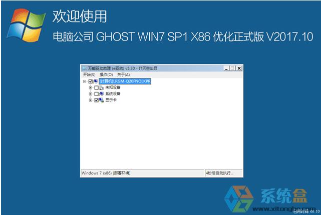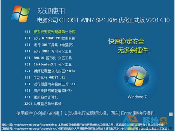 Windows 7,中文名稱視窗7,是由微軟公司(Microsoft)開發的操作系統,內核版本號為Windows NT 6.1。Windows 7可供家庭及商業工作環境:筆記本電腦 、平板電腦 、多媒體中心等使用。和同為NT6成員的Windows Vista一脈相承,Windows 7繼承了包括Aero風格等多項功能,并且在此基礎上增添了些許功能。 ![]() ![]() ![]() ![]() 電腦公司 GHOST WIN7 SP1 X86 優化正式版 V2017.10 具有更安全、更穩定、更人性化等特點。電腦公司系統集成了最新的安全補丁及常用軟件,實現了全自動無人值守安裝,非常適合電腦城工作人員日常裝機操作,是您快速裝機之首選。 一、版本更新內容 1、更新了系統補丁和Office2007 3in1所有補丁到2017-10(可通過微軟漏洞掃描和衛士漏洞掃描) 2、升級Internet Explorer為IE9 3、增加數款驅動的支持,支持最新的H67 H77 Z77等主板 4、更新壓縮文檔管理軟件 WinRAR 至官方5.01 版 5、更新硬盤安裝器,增加硬盤安裝系統兼容性 6、更新DOS和PE下的分區工具DiskGenius為3.5版 7、安裝可在無人看管的情況下完成。裝機任務再多,也能從容應付 8、重視備份。電腦不可能總不出問題,系統維護不可無備份 9、更新IT天空最新萬能驅動V5.3版本 二、安裝最低配置要求 1、處理器:1 GHz 32位處理器 2、內 存:1 GB 及以上 3、顯 卡:支持DirectX 9 128M 及以上(開啟AERO效果) 4、硬盤空間:16G以上(主分區,NTFS格式) 5、顯示器:要求分辨率在1024X768像素及以上,或可支持觸摸技術的顯示設備。 三、安裝方法 在安裝系統前,請注意備份C盤上的重要數據,系統重裝會重置C盤,建議提前轉移個人資料并備份硬件驅動。下面推薦三種安裝系統的方式,用戶根據自己的情況選擇方法安裝。 1、硬盤安裝(無光盤、U盤,推薦) 將下載的ISO系統鏡像文件解壓到除系統盤(默認C盤)外的其他盤根目錄,例:(D:\),右鍵以管理員身份運行“硬盤安裝.exe”;