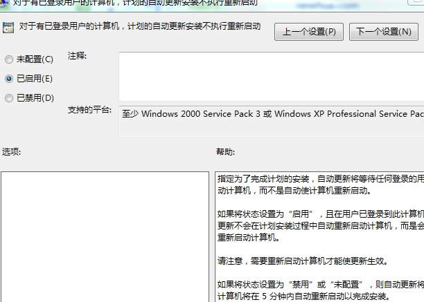 在右邊的選項中雙擊“對于已登錄的用戶,計劃的自動更新安裝不執行重新啟動”選項,在屬性窗口內設置,默認為“未配置”,這里我們需要選擇下方的“已啟用”。