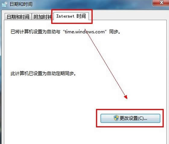 那么如何才能保證時間的準確性呢?畢竟自己調整的時間是可能出現誤差的,所以最好的調整時間的方式是讓win7電腦自動同步網絡時間,這個操作也非常的簡單,只需要切換到“Internet 時間”中,你就會看到有個“更改設置”,點擊進行修改。