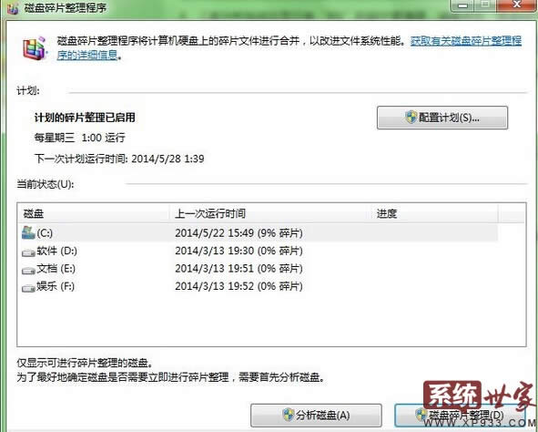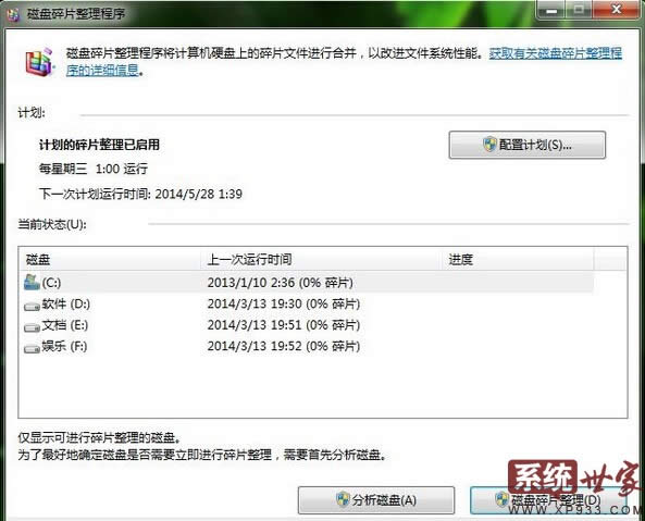 此外,不想每次都手工運行磁盤碎片清理的話,也可以通過“配置計劃”進行設置,讓“磁盤碎片清理”在每周固定的時間自動進行,以保證Win7的減負加速。