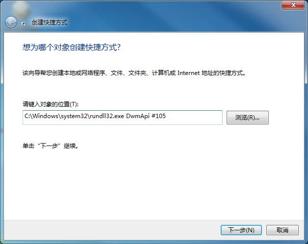 2、在“請鍵入項目的位置”中輸入“C:\Windows\system32\rundll32.exe DwmApi #105”,然后點下一步。