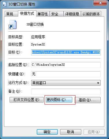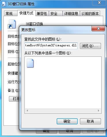 4、在該快捷圖標上右鍵-屬性-在屬性窗口下,單擊“更改圖標”,在該文件夾中查找圖標中輸入%SystemRoot%\System32\imageres.dll或者%SystemRoot%\system32\SHELL32.dll,然后回車或者點擊下面空白處,會出現圖標,選擇自己喜歡的圖標即可。