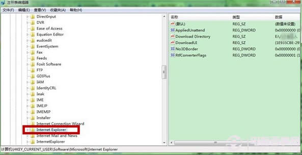 第二步、在“注冊表編輯器”窗口,依次找到[HKEY_CURRENT_USER\Software\Microsoft\Internet Explorer]。