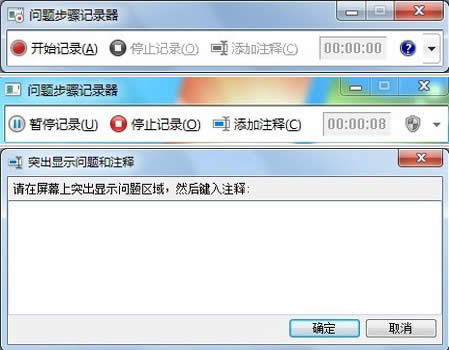 單擊“開始記錄”按鈕,即可將“問題步驟記錄器”處于錄制狀態(tài),監(jiān)視屏幕上的鼠標(biāo)操作,并會(huì)顯示錄制時(shí)間。點(diǎn)擊添加注釋,還可以在屏幕上突出的問題區(qū)域,添加和鍵入注釋,加以重點(diǎn)說明。