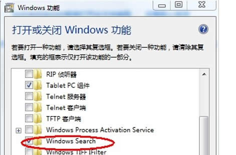 2. 在隨后打開(kāi)的對(duì)話框中,找到并勾選“Windows Serach”,在最后會(huì)彈出一個(gè)對(duì)話框,然后“確定”,等上幾分鐘就行。接著點(diǎn)“開(kāi)始”就能看到搜索框了。