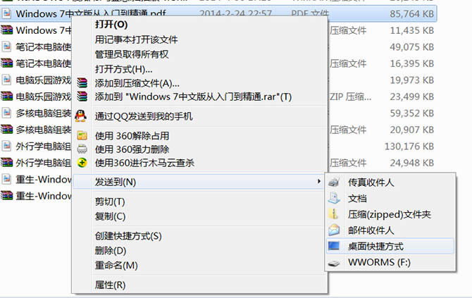 選擇“桌面快捷方式”命令右擊需要在桌面創(chuàng)建快捷方式的文件,在彈出的快捷菜單中 選擇"發(fā)送到桌面快捷方式"命令。