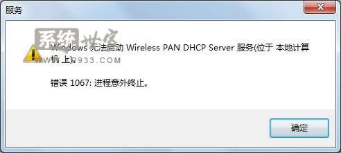 Windows 7,中文名稱視窗7,是由微軟公司(Microsoft)開發的操作系統,內核版本號為Windows NT 6.1。Windows 7可供家庭及商業工作環境:筆記本電腦 、平板電腦 、多媒體中心等使用。Windows 7可供選擇的版本有:入門版(Starter)、家庭普通版(Home Basic)、家庭高級版(Home Premium)、專業版(Professional)、企業版(Enterprise)(非零售)、旗艦版(Ultimate)。 windows7筆記本無法啟動wireless pan dhcp server解決方法:故障現象: Windows 7系統使用無線時提示“windows無法啟動wireless pan dhcp server服務"(位于本地計算機上)。錯誤1067:進程意外終止。如下圖所示:
