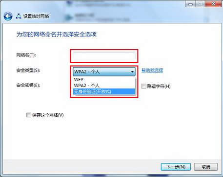 4、為創建的網絡命名并選擇合適的安全類型 如圖所示:
