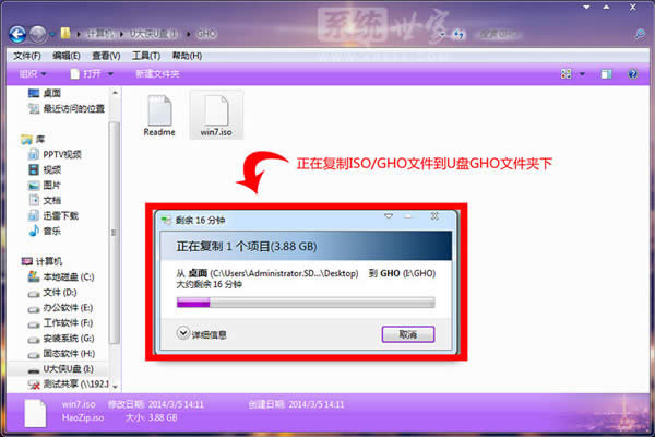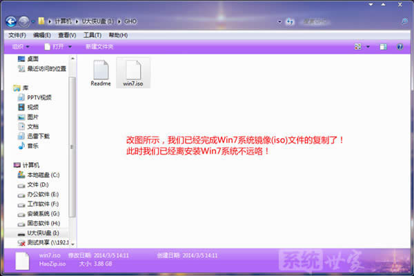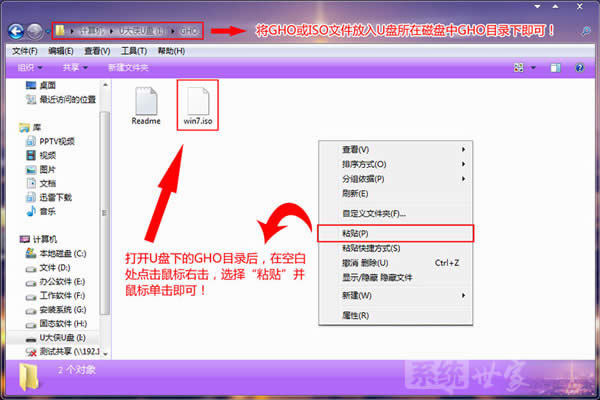 U盤的強大功能,以及U盤的便攜性讓U盤成為大眾最受歡迎的安裝系統工具,用U盤安裝系統的方式逐漸成為一種主流趨勢,下面小編就詳細地來給大家演示一下,如何用U盤在win8pe下安裝win7系統。 一、U盤啟動盤制作前準備(注意操作前備份好U盤有用的資料) 1.準備一個使用U大俠軟件制作好的啟動u盤一個(最好1G以上的空的U盤)。 2.下載Ghost Win7系統鏡像文件。 Ghost Win7系統鏡像文件下載地址:http://www.xp933.com/windows7/ 二、具體操作步驟: 【第一步】將Ghost Win7系統鏡像包復制到U盤GHO文件夾內。 注意:有時制作完成后,打開U盤找不到GHO目錄或提示格式化U盤,可以點擊這里查看:找不到GHO目錄或者U盤提示需要格式化的解決方法! 將下載好的系統鏡像包復制到u盤GHO文件夾內!如下圖所示: