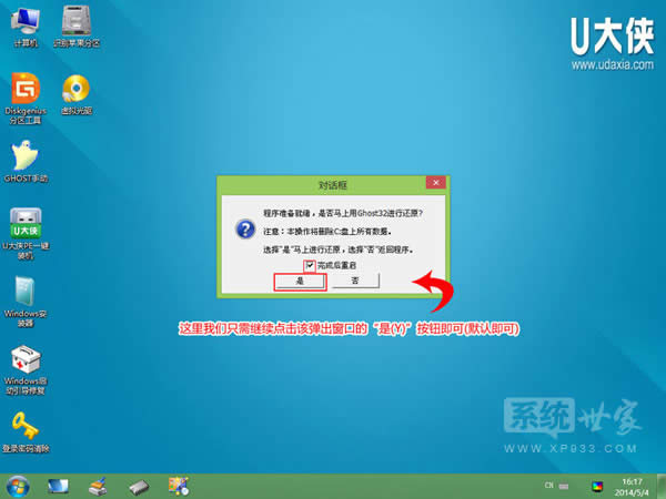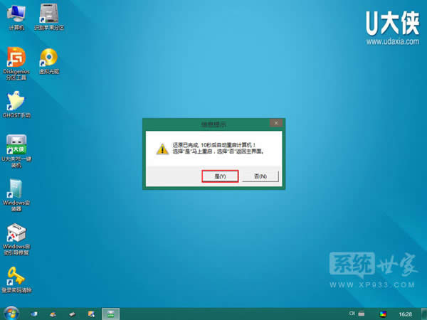 4)運行“U大俠PE一鍵裝機”工具后,該軟件會自動識別ISO鏡像文件(即剛才我們下載復制到U盤GHO文件夾里面的那個ISO鏡像包),并自動提取里面的GHO文件。我們只需點擊“確定(Y)”按鈕即可!如下圖所示: