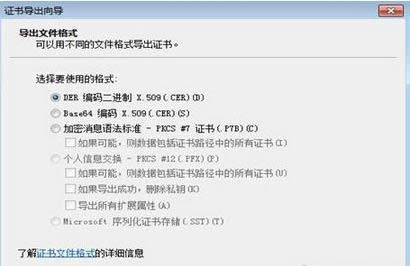 4、在“導(dǎo)出文件格式”界面中,選擇要使用的證書文件格式,通常無需再選擇,按照默認(rèn)設(shè)置即可,如下圖示。