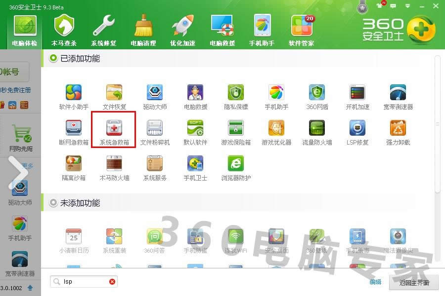如果誤刪除了win7系統的重要文件,在系統啟動時報文件丟失錯誤就如何恢復被誤刪除的系統文件呢?現在win7筆記本系統為大家詳解文件丟失的處理以及要找回丟失的系統文件方法告訴大家。 誤操作導致系統文件被刪除, 【簡易步驟】: 【360安全衛士】—【功能大全】(更多)—【系統急救箱】—【系統修復】。 【解決方案】: 使用360系統急救箱修復系統文件丟失問題 1. 打開【360安全衛士】—【功能大全】(更多)—【系統急救箱】—【系統修復】。(如圖1、2)