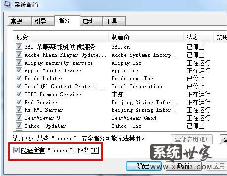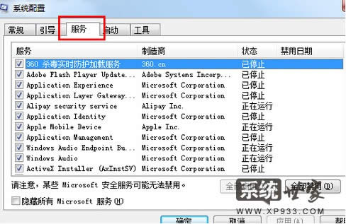 切換到服務(wù)選項,然后將下方的隱藏所有microsoft選項勾選上。現(xiàn)在上面的窗口中出現(xiàn)的服務(wù)就是真實的電腦中第三方加載項的全部服務(wù)項目了,大家可以看看,哪些是不需要的,就將它刪除好了。