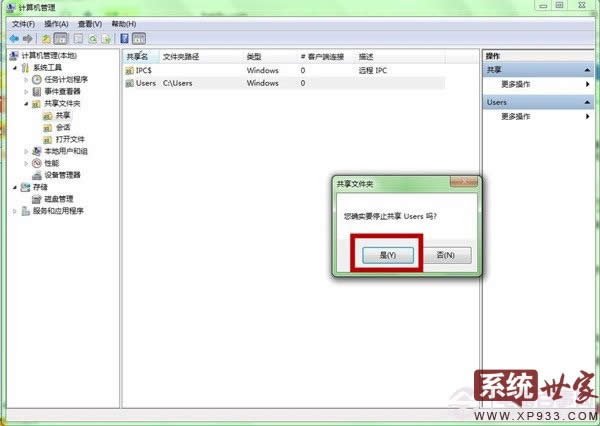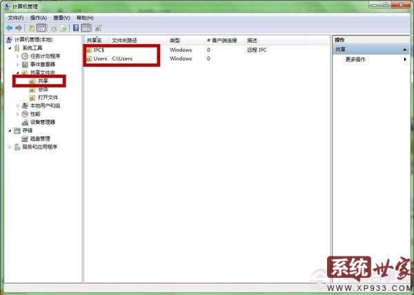 第二步、 在“計算機管理”窗口的左側,依次找到“計算機管理”-“系統工具”-“共享文件夾”-“共享”,單擊“共享”文件夾,在窗口中間就可以看到共享文件夾。