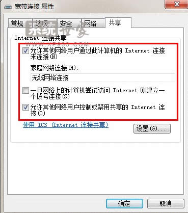 手動檢查是否開啟共享的方法,如下圖本機使用ADSL撥號上網所以要確認寬帶連接屬性中的共享已經開啟