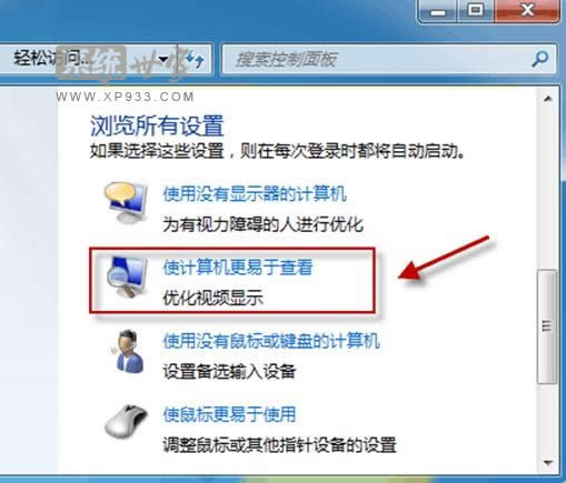 拉動滑塊到“瀏覽所有設(shè)置”。單擊“使計算機更易于查看”;
