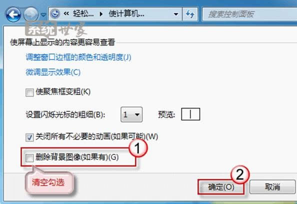 查看一下窗口底部“使屏幕上顯示的內(nèi)容更易于查看”部分“刪除背景圖像(如果有)”是否被勾選?如果有,請清空勾選;
