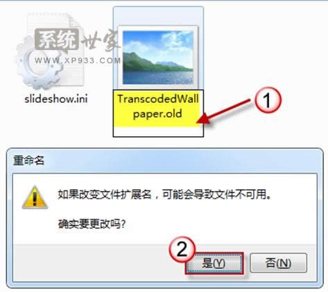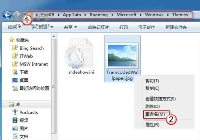 將 TranscodedWallpaper.jpg 重命名為 TranscodedWallpaper.old。(如果文件后綴名不可見,按一下“Alt+T”調(diào)出工具欄,打開“工具->文件夾選項”,在“查看”選項卡上取消勾選“隱藏已知文件的擴展名”。)