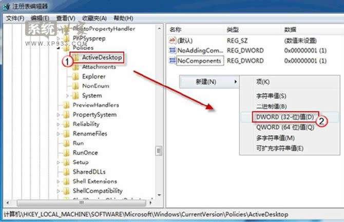 單擊展開 ActiveDesktop,在右邊細節(jié)窗口右鍵鼠標,選擇“新建->DWord 值”,命名為 NoChangingWallPaper;