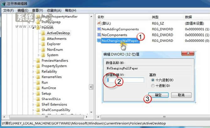 為新建值 NoChangingWallPaper 賦值。1表示阻止更改,0表示允許更改。這里,將其賦值為0;