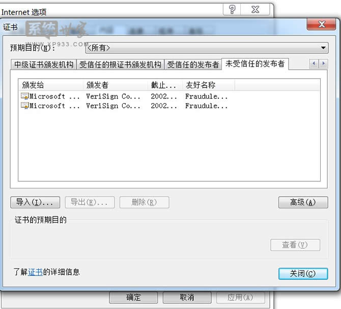 Windows 7,中文名稱視窗7,是由微軟公司(Microsoft)開發的操作系統,內核版本號為Windows NT 6.1。Windows 7可供家庭及商業工作環境:筆記本電腦 、平板電腦 、多媒體中心等使用。Windows 7可供選擇的版本有:入門版(Starter)、家庭普通版(Home Basic)、家庭高級版(Home Premium)、專業版(Professional)、企業版(Enterprise)(非零售)、旗艦版(Ultimate)。 解決win7筆記本安裝FLASH時提示證書驗證失敗故障技巧 1、首先打開IE瀏覽器,然后點擊菜單欄上面的“工具-Internet選項”項; 2、在彈出來的Internet選項窗口中,切換到“內容”選項卡下,然后在下方證書欄下點擊“發行者”按鈕;