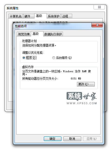 第二步、再跳到“性能選項”的對話框中選擇“高級”選項卡,然后點擊“更改..."進行虛擬內存的設置。