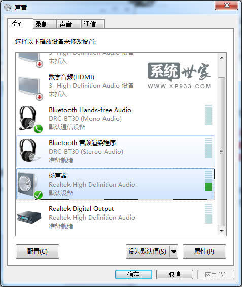 Windows 7,中文名稱視窗7,是由微軟公司(Microsoft)開發的操作系統,內核版本號為Windows NT 6.1。Windows 7可供家庭及商業工作環境:筆記本電腦 、平板電腦 、多媒體中心等使用。Windows 7可供選擇的版本有:入門版(Starter)、家庭普通版(Home Basic)、家庭高級版(Home Premium)、專業版(Professional)、企業版(Enterprise)(非零售)、旗艦版(Ultimate)。 Win7 32位系統雙聲卡怎么切換,小女友不肯獨自看她的電影,非得粘著你,可是會影響你的游戲了,怎么辦呢?我們可以使用多屏顯示的時候,一個玩游戲一個看電影,然后怎么把游戲聲音和電影分開輸出的話,我們現在使用雙聲卡來完成這個功能。一般的主板都會帶個板載聲卡,然后可以自己加個PCI或USB的獨立聲卡,當然也可以使用藍牙音頻渲染當第二個聲卡。這里用藍牙耳機當第二個音頻輸出,音箱播放游戲和其他電腦聲音,藍牙耳機播放電影聲音。 如果是藍牙音頻渲染當聲卡的話,首先鏈接藍牙耳機(或音箱),系統會自動下載對應的藍牙音頻渲染驅動,此時設備中可以看到對應的藍牙驅動