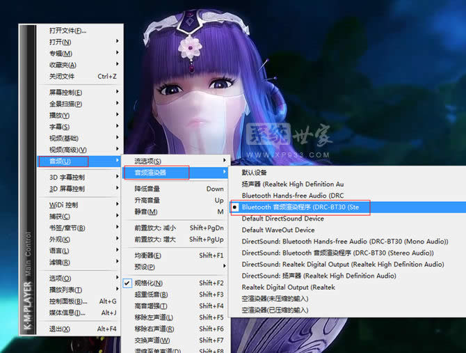 接著,我們打開視屏播放軟件,這里必須選擇一些能夠設置音頻輸出的播方軟件,很多目前主流的傻瓜式軟件(如暴風影音、QQ音樂等)是無法設置音頻輸出設備的。視頻個人喜歡用愛奇藝視頻,音頻用酷狗。 以KMPlayer為例(其他可以設置音頻輸出的也類似),打開播放器,右鍵選擇 音頻-> 音頻渲染器 -> Bluetooth音頻渲染程序。 設置好后,KMPlayer播放器的聲音就輸出到藍牙耳機上了。而電腦上的游戲、音樂等聲音就留在了揚聲器上。這樣是不是挺好玩的哦。。。