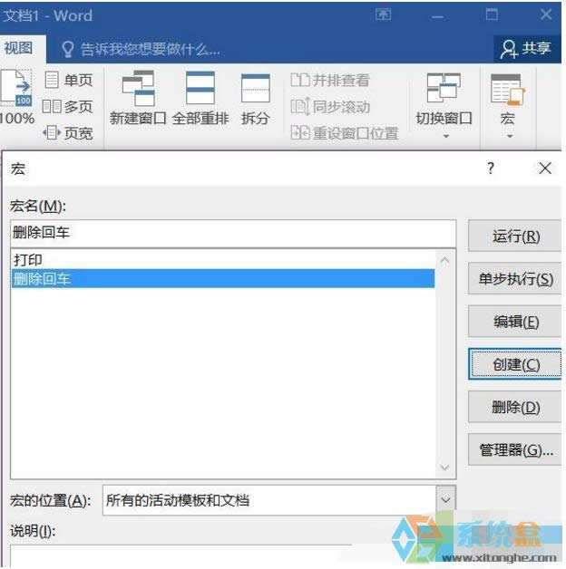 具體如下: 1、首先我們打開一個Word文檔,然后點擊視圖,切換到視圖頁面后,在工具欄中找到“宏”,這時會彈出一個對話框,我們輸入“刪除“”車,然后點擊創(chuàng)建,如圖所示。