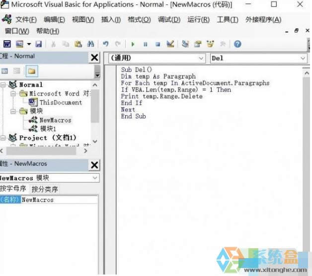 3、這時,在右側會有一個空白的輸入框,我們按照順序輸入以下內容:(如圖所示) Sub Del() Dim temp As Paragraph For Each temp In ActiveDocument.Paragraphs If VBA.Len(temp.Range)=1 Then temp.Range.Delete End If Next End Sub