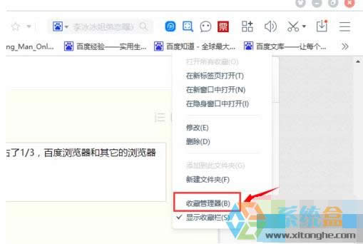 2、我們可以在任意一個(gè)我們收藏的網(wǎng)站上鼠標(biāo)右鍵單擊,這時(shí)在彈出的菜單中選擇“收藏管理器”。